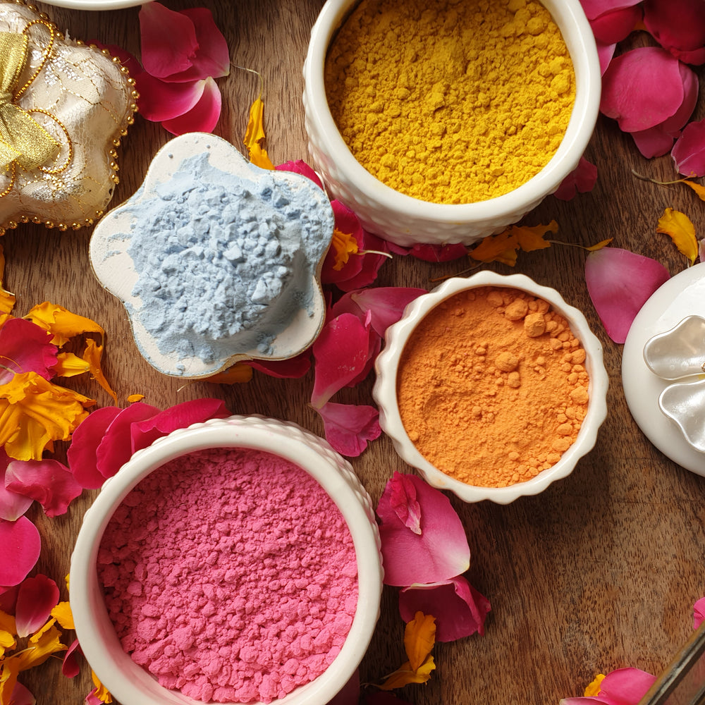 Our pastel gulals and natural water colours are reflections of the season's blooms with tesu, rose, majith, marigolds and more. They are extremely gentle and will not damage your skin and hair.