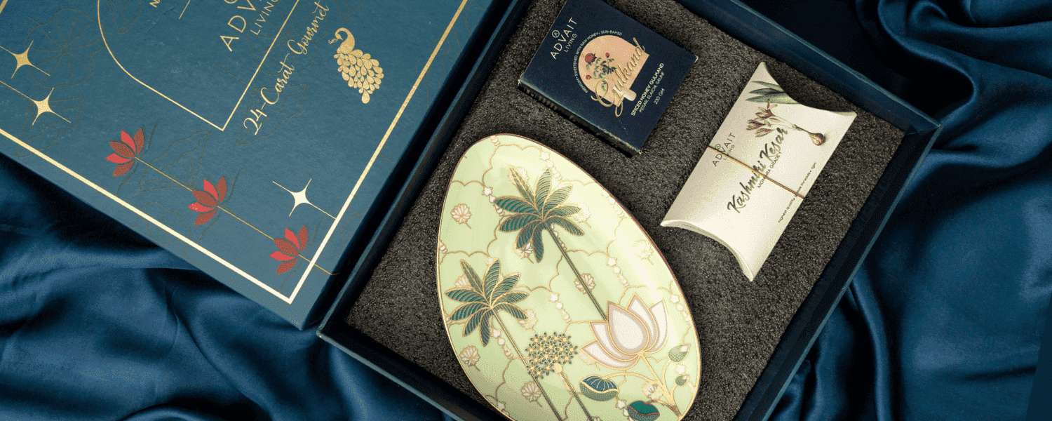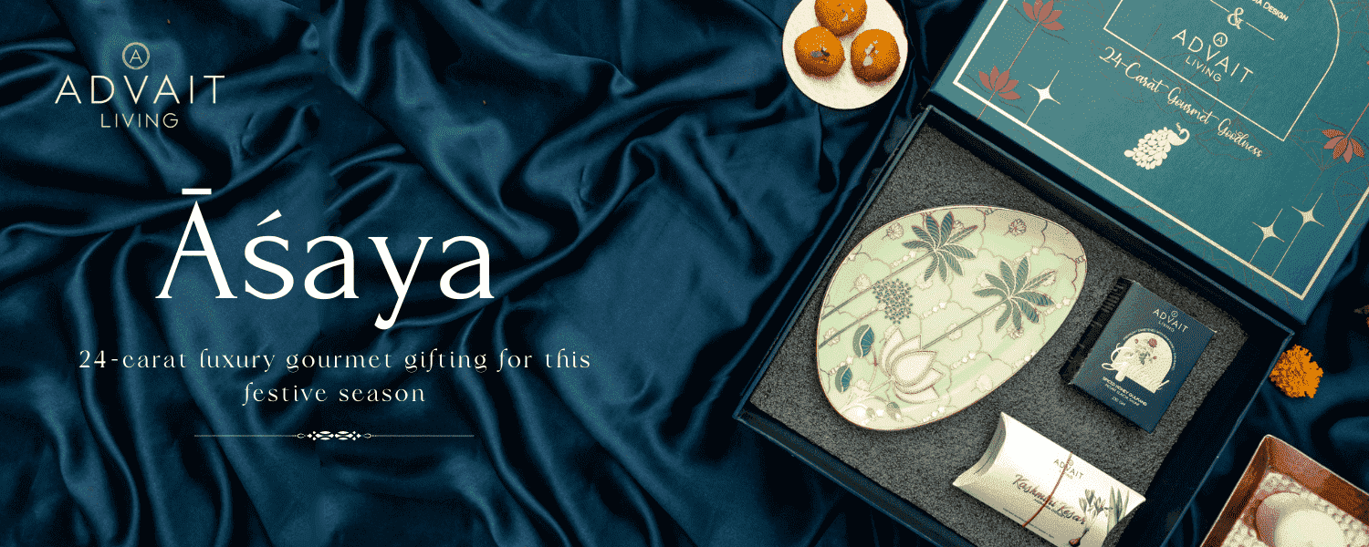The Āśaya Dessert Box is the perfect luxury gifting choice for any special occasion. This artisanal collection includes a 24-carat gold embellished Pichwai Kamal serving platter, spiced honey gulkand, and premium Kashmiri kesar, offering a luxurious experience infused with tradition and gourmet delights. Each component is inspired by the intricate Pichwai art of Rajasthan, ensuring this dessert box is not just a gift but a symbol of heritage and fine craftsmanship. With its elegant packaging and carefully curated contents, the Āśaya Dessert Box stands out as an ideal option for Diwali gifting, corporate gifting, or any festive occasion.