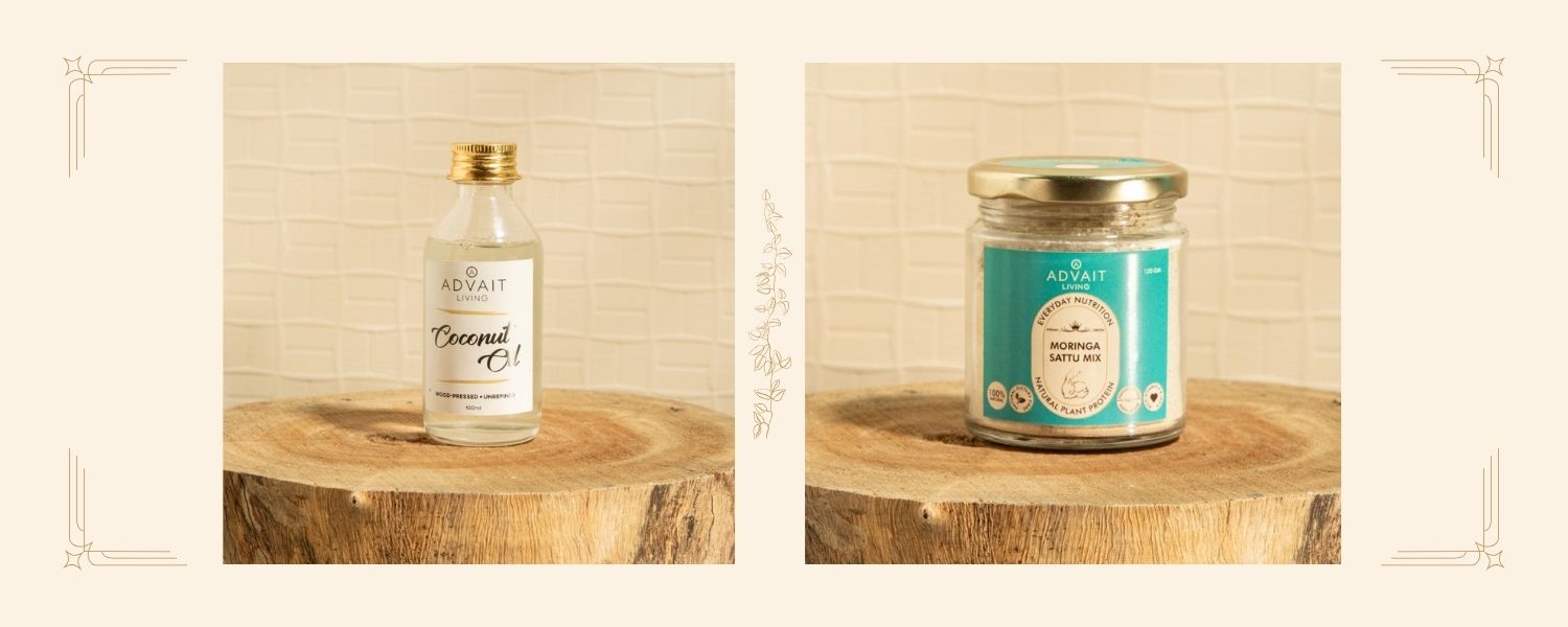 Nourish body and soul this Diwali with our Super Healthy Festive Potli. This eco-friendly hamper features wood-pressed virgin coconut oil and 100% natural moringa sattu mix, a perfect blend of health and purity. Experience the joy of natural, wholesome products with Advait Living.