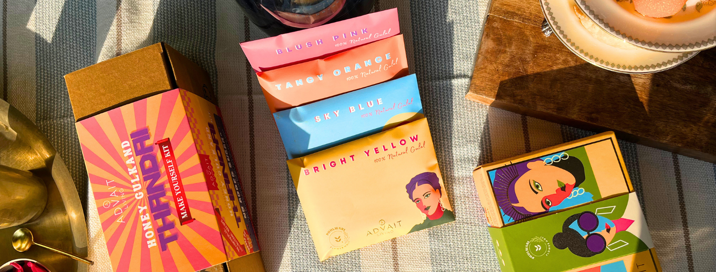 Our gulals come in pastel shades because we don't use any synthetic dyes to make them. Synthetic dyes or pigments are commonly used to get bright or shiny colours and textures. These gulals are then delicately packed into individual paper packets.