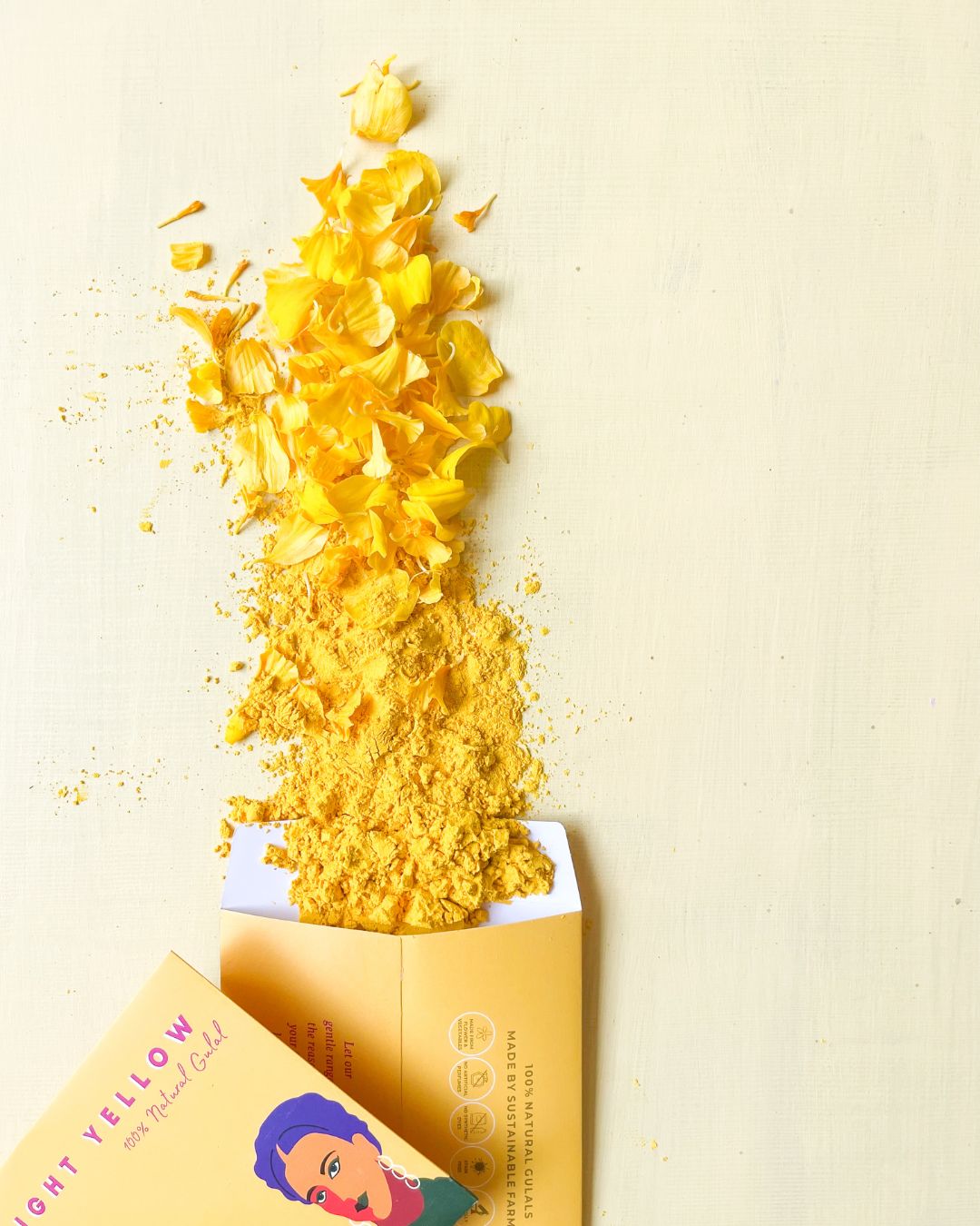 Our gulals come in pastel shades because we don't use any synthetic dyes to make them. Synthetic dyes or pigments are commonly used to get bright or shiny colours and textures. These gulals are then delicately packed into individual paper packets.