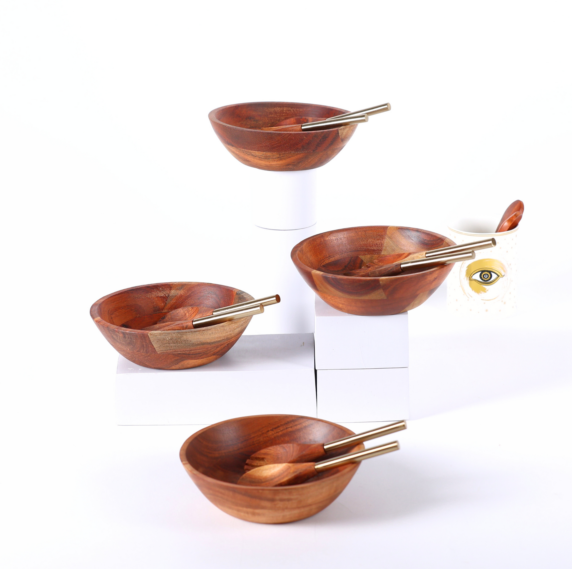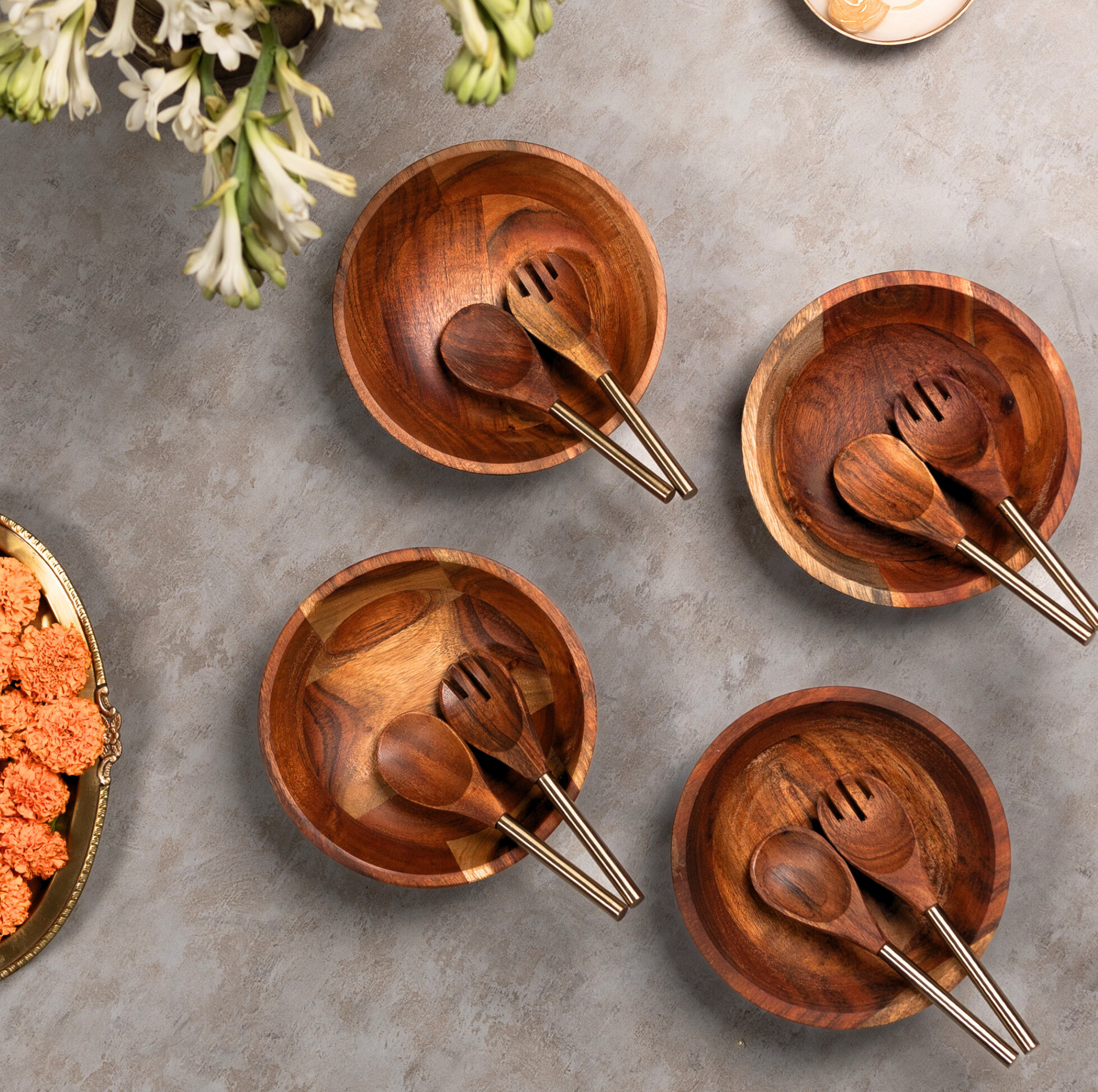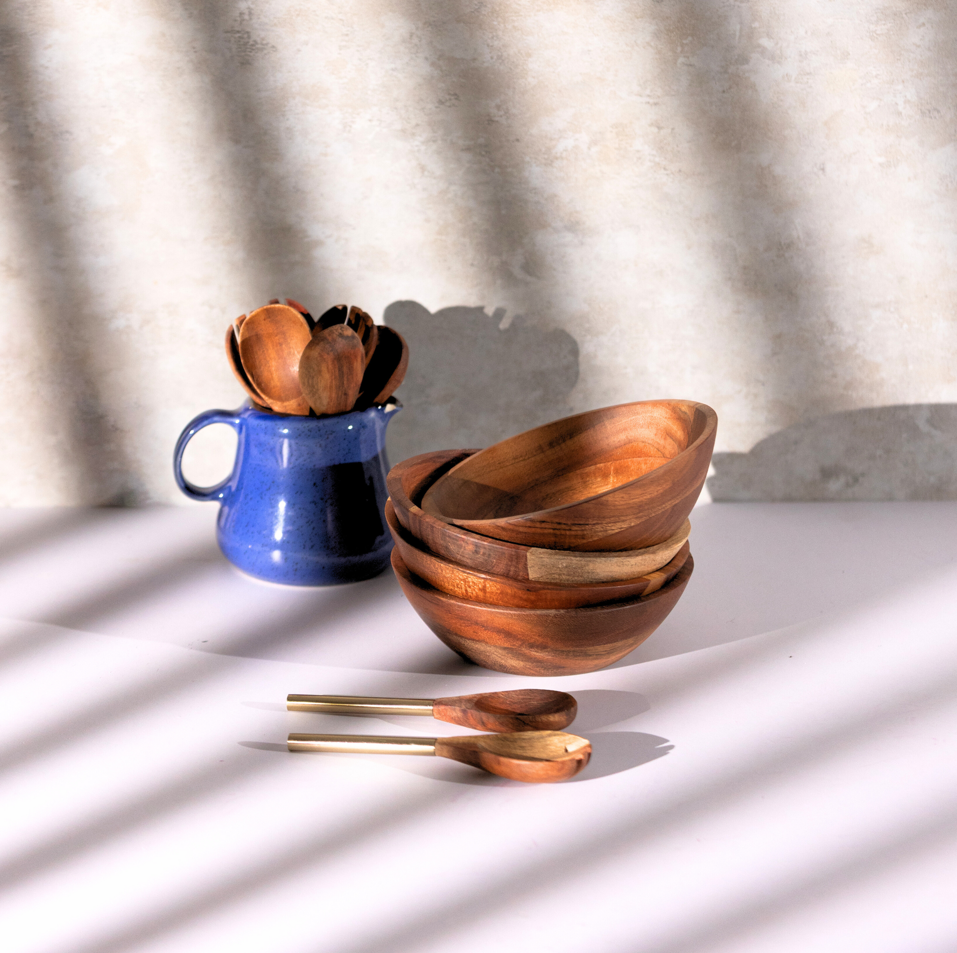 Accompanied by sleek wooden servers, this set is perfect for salads, small sharing plates, or mindful dining rituals. The natural grains of Acacia wood ensure that no two pieces are ever alike, making each bowl a unique heirloom addition to your table. Durable and sustainable, they are crafted to age gracefully while carrying forward the story of conscious craftsmanship.