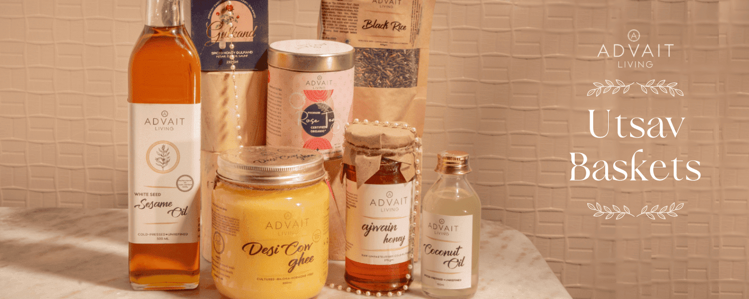 The Utsav Premium Gift Basket is packed with nutrient-rich whole foods, each chosen for its potential health benefits. A2 desi cow ghee is rich in butyric acid and supports gut health and digestion. Cold pressed sesame oil is a good source of healthy fats, including omega-3s. Raw honey contains antioxidants, whereas black rice is rich in fibre and protein.